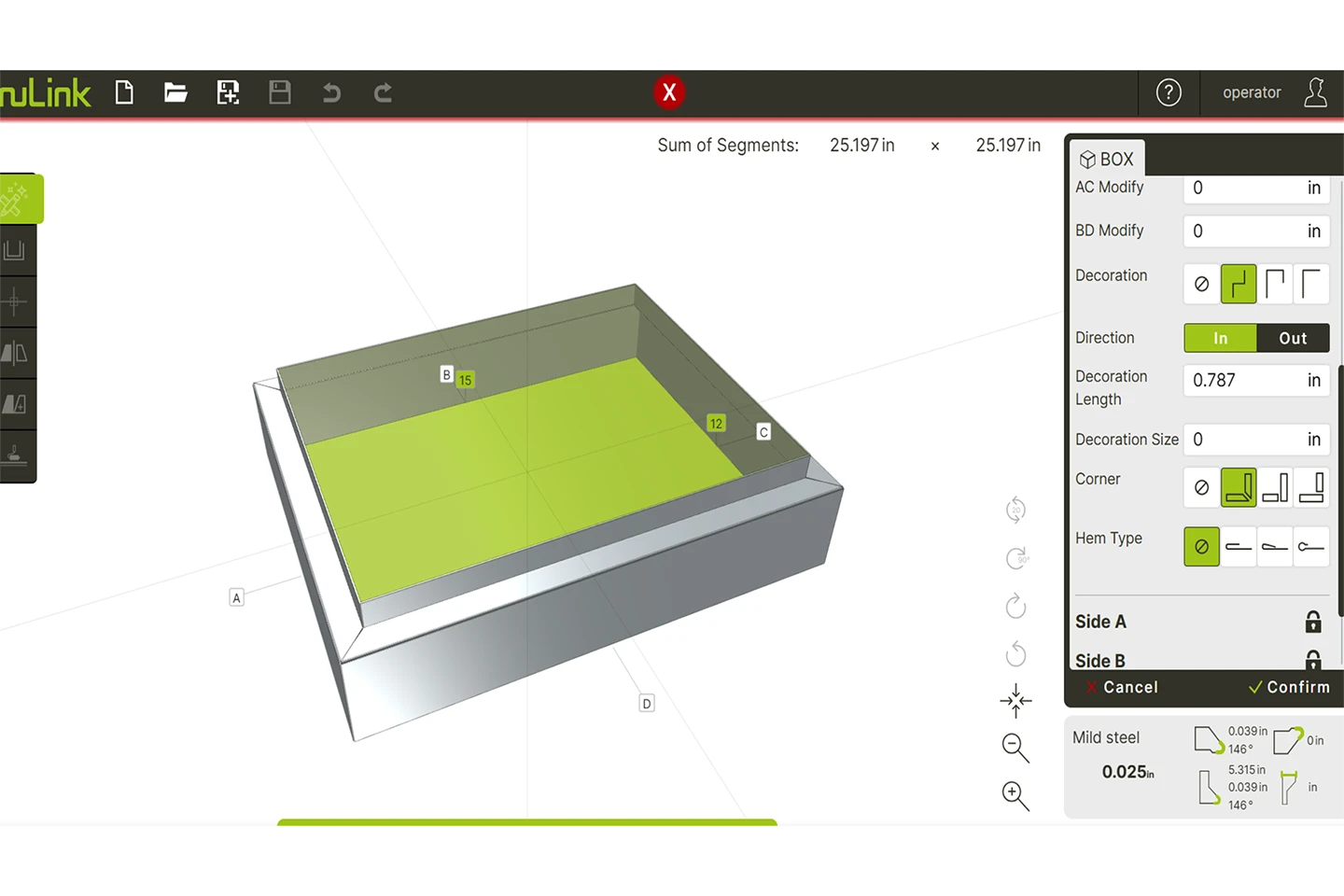 Erstellen Sie mit nur einem Klick Boxprofile im Box Generator unseres neuen Steuerungssystems. Starten Sie neu oder verfeinern Sie vorhandene Voreinstellungen einfach per Drag-and-Drop. Zu den integrierten Optionen gehören Fasen, Radien, Segmentverbindungen und vieles mehr. Leistungsstarke Punktbearbeitungs- und Snap-Tools gewährleisten höchste geometrische Präzision. Funktionen wie Mehrfachauswahl sowie vollständige Wiederherstellungsoptionen ermöglichen eine schnelle Iteration. Die integrierte 3D-Ansicht unterstützt die Überprüfung der Geometrie vor der Produktion und erlaubt es Bedienern, selbst komplexe Boxen und Prototypen direkt an der Steuerung zu entwerfen – ganz ohne externe CAD/CAM-Unterstützung.