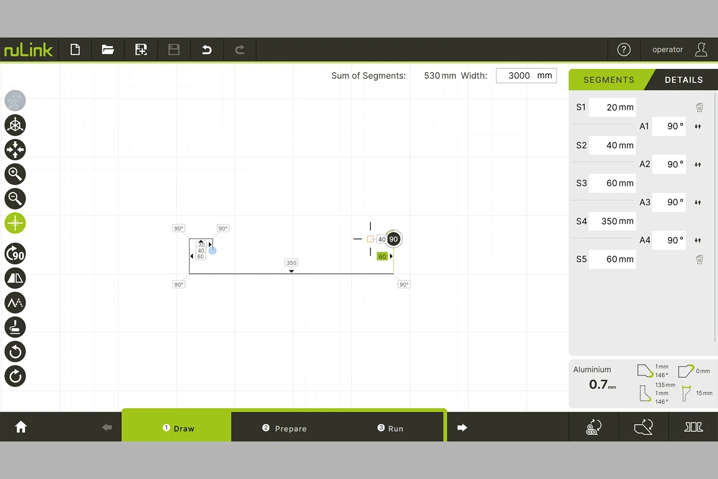Erstellen Sie Profile in Sekundenschnelle mit dem Touch-First-Zeicheneditor unseres neuen intelligenten Steuerungssystems. Definieren Sie Geometrien per Drag-and-Drop und öffnen Sie mit einem Fingertipp das Menü, um Kanten und Radiusbiegungen hinzuzufügen. Intuitiv bedienbare Funktionen machen die Bedienung einfach und gewährleisten gleichzeitig die Präzision, die Experten erwarten. Das Ergebnis: weniger Abhängigkeit von Fachwissen, schnellere Einarbeitung und höhere Flexibilität in der Fertigung.